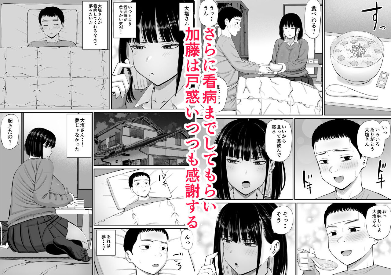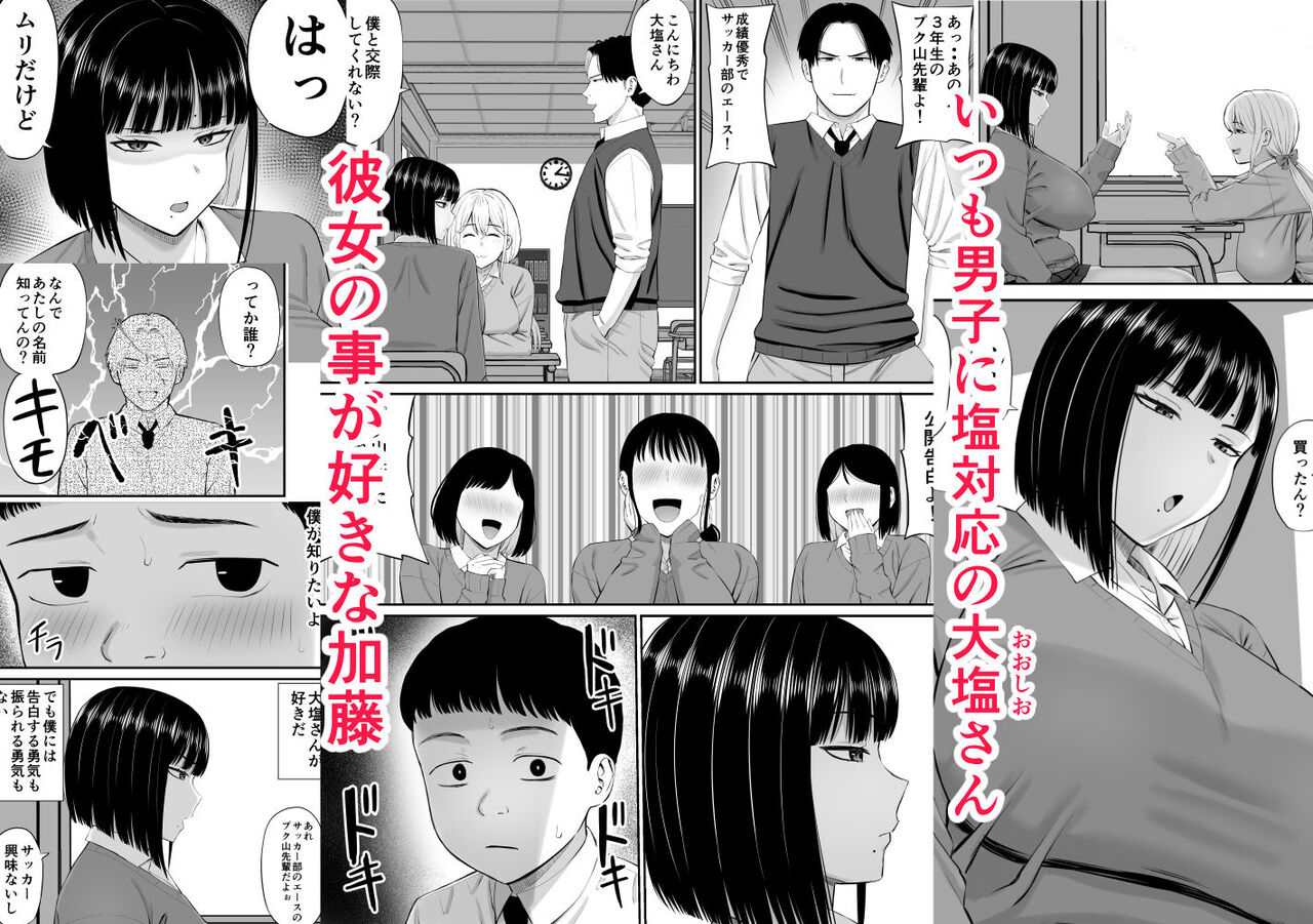 いつも男子に塩対応な胸が人一倍大きな「大塩」さん。しかし、そんな彼女のことが密かに好きな「加藤」。ある日、熱で休んだ時にプリントを届けに来てくれる。さらに親が不在で病院にも行ってないとわかると市販薬まで買って来て看病までしてくれる。その優しさから今までの想いが抑えきれずに告白するとまさかの流れになって…!?