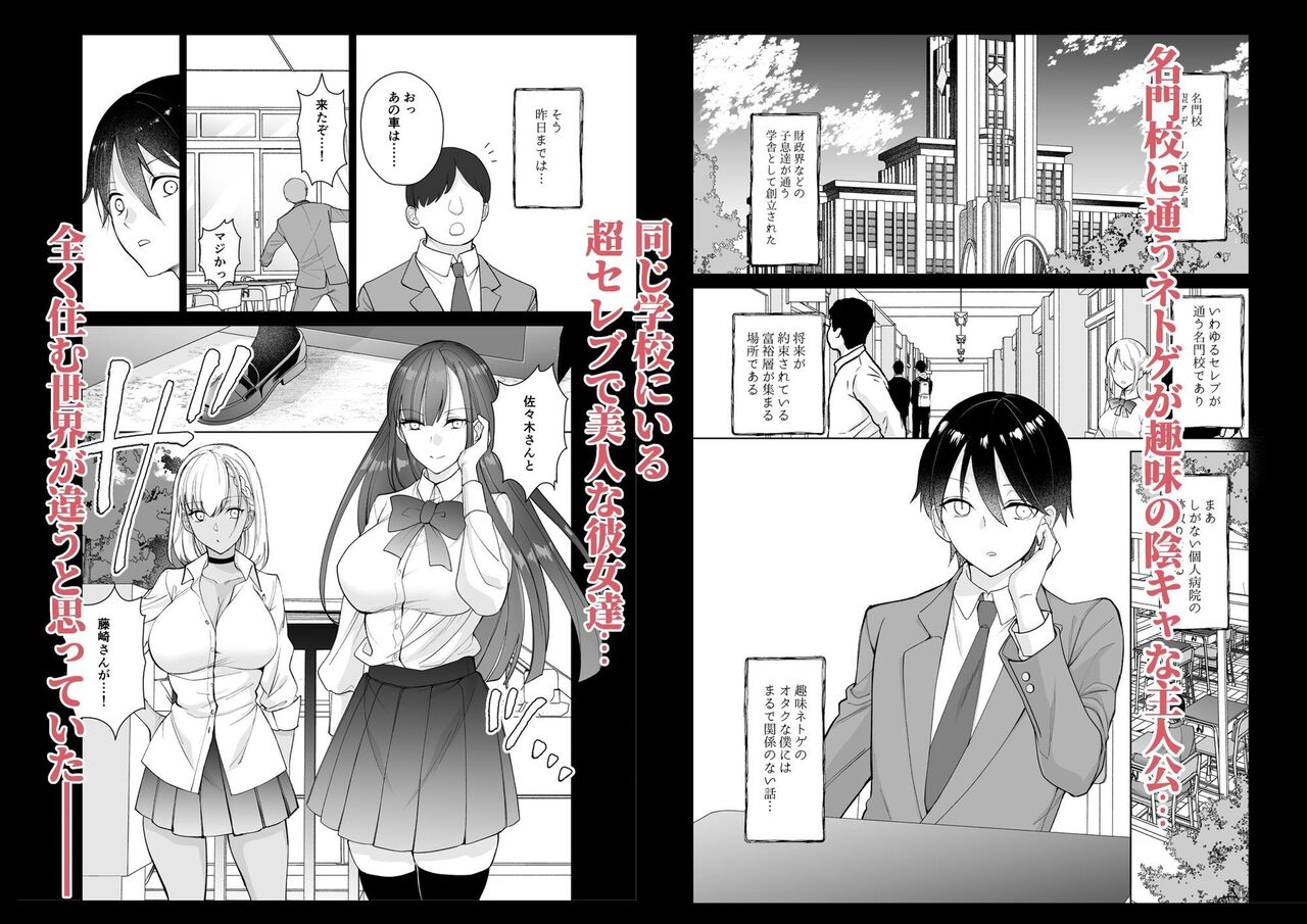 名門校に通うネトゲ趣味の陰キャの主人公。同じクラスには超セレブで美人の同級生の2人がいた。全く無縁な存在だと思っていたある日、ネトゲのオフ会にまさかの2人が現れる。その後、予期せぬ展開でラブホに入ってしまい、実はずっと好きだったと告げられてオフパコを持ちかけられて…!?